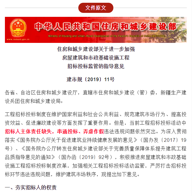 住房和城乡建设部发布《关于进一步加强房屋建筑和市政基础设施工程招标投标监管的指导意见》。