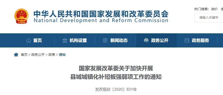 6月3日,国家发改委发布《关于加快开展县城城镇化补短板强弱项工作的通知》,选择120个县及县级市开展县城新型城镇化建设示范工作,占全国县及县级市(1881个)的6%。