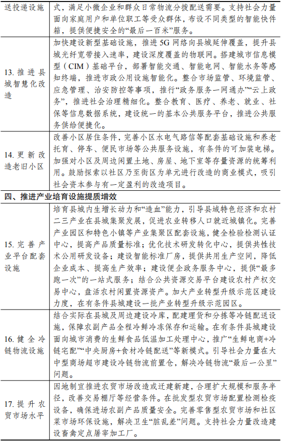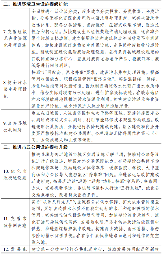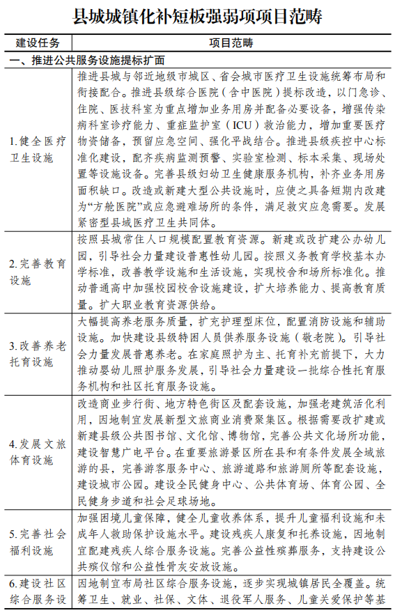 明确目标区域 各地区要统筹配置城镇化补短板强弱项工作的公共资源,重点投向县城新型城镇化建设,并在布局建设各类公共设施时,注重做好与邻近地级市城区同类设施的衔接配套。兼顾县级市城区,以及镇区常住人口10万以上的非县级政府驻地特大镇,将其一并纳入目标区域。