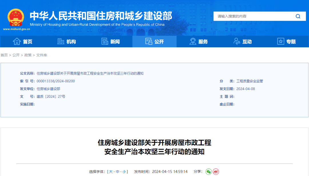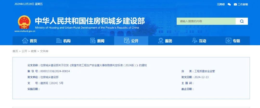 住房城乡建设部印发《房屋市政工程生产安全重大事故隐患判定标准(2024版)》