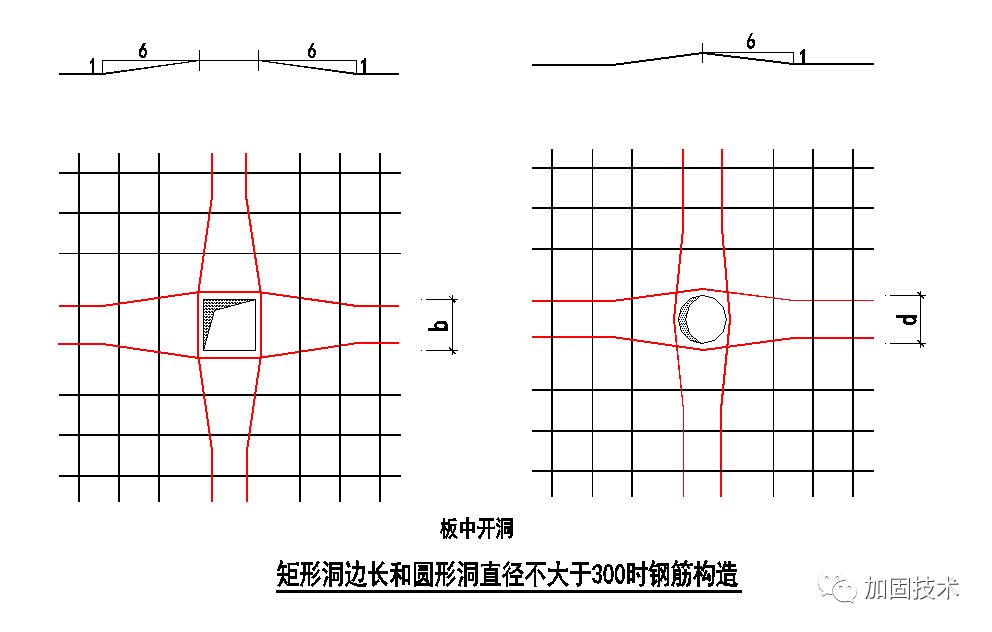 ① 当单(双)向楼板矩形开洞宽度b(b为垂直于板跨度方向的开洞宽度)圆形开洞直径d≤300mm时,切断钢筋数量≤5%时,可不作处理;