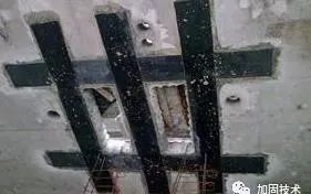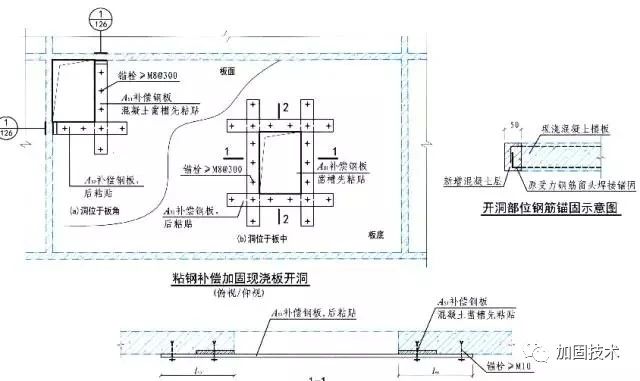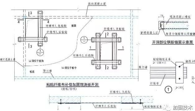 现浇连续板开洞,当开洞位置位于板的负弯矩区时,采用粘钢作为补偿加固时,应双面加固。对于粘贴钢板加固法,受力较大方向宜粘贴在最外层(其含义就是最后粘贴),受力较小方向钢板钢板粘贴于里层(最先进行粘贴)。