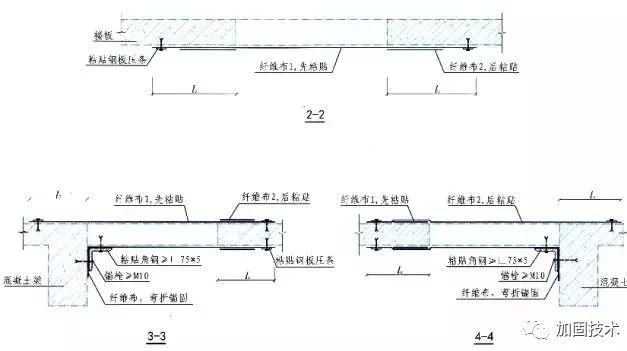 此时,先粘钢板应于混凝土贴面处开槽,开槽厚度≥钢板厚度+3mm,以保证先粘钢板面与楼板地面齐平。亦可双向齐平粘贴,但需将受力较小方向钢板切成三段,现场焊接,局部后灌胶粘剂。