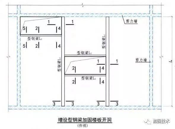 改变应力传递可采用洞口处新增梁进行支撑传递,方法如下:1)型钢可采用H型钢、槽钢、工字钢和组合型钢,增设钢梁后,需复核改变结构体系的承载力。2)型钢梁与楼板楔紧后灌注胶粘剂或高强水泥浆。
