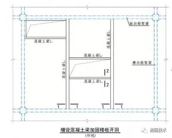 当楼板开洞进一步扩大,导致洞口宽度或洞口直径大于1000mm,或切断钢筋数量超过20%时,以及洞口存在较大集中荷载、预制板切断主肋等情况下,仅靠碳纤维布或钢板起到的加固作用将非常有限,应改变传力路径以减少应力集中对楼板受力产生的不利影响。
