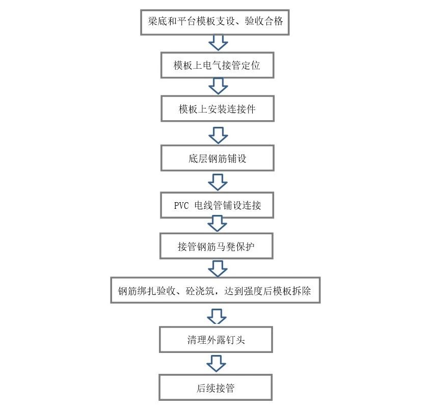 针对传统工艺下PVC电线管预埋敷设需要在模板上开洞易造成质量缺陷的问题,采用模板免开洞预埋工艺,杜绝了上述质量缺陷。