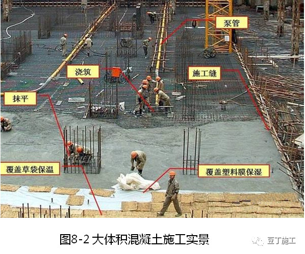 ⑺ 养护:大体积混凝土浇筑完毕后,应在12h 以内加以覆盖和浇水,普通硅酸盐水泥拌制的混凝土养护时间不得少于14d ;矿渣水泥、火山灰水泥等拌制的混凝土养护时间不得少于21d。