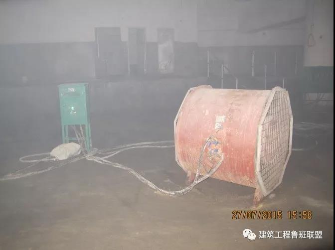 送排风系统开启加快地下室空气流动性,降低地下室空气温湿度,临时鼓风机布置在送排风系统暂时无法影响部位及坡道处,尽可能将室外干燥空气引入到室内。