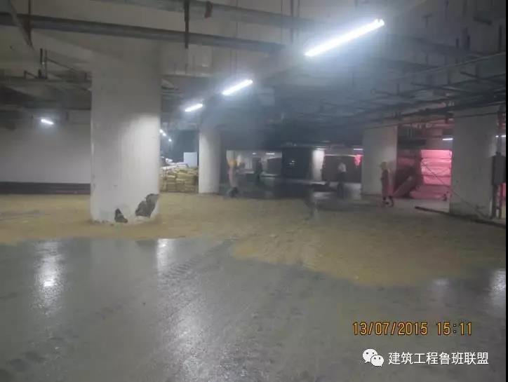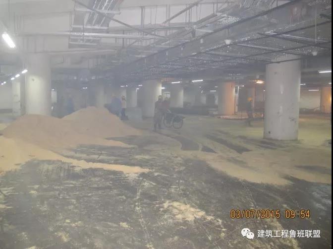 每天在地下室各层保证一定数量的清扫人员对地面垃圾、积水进行大面积清理,木屑干燥地面。