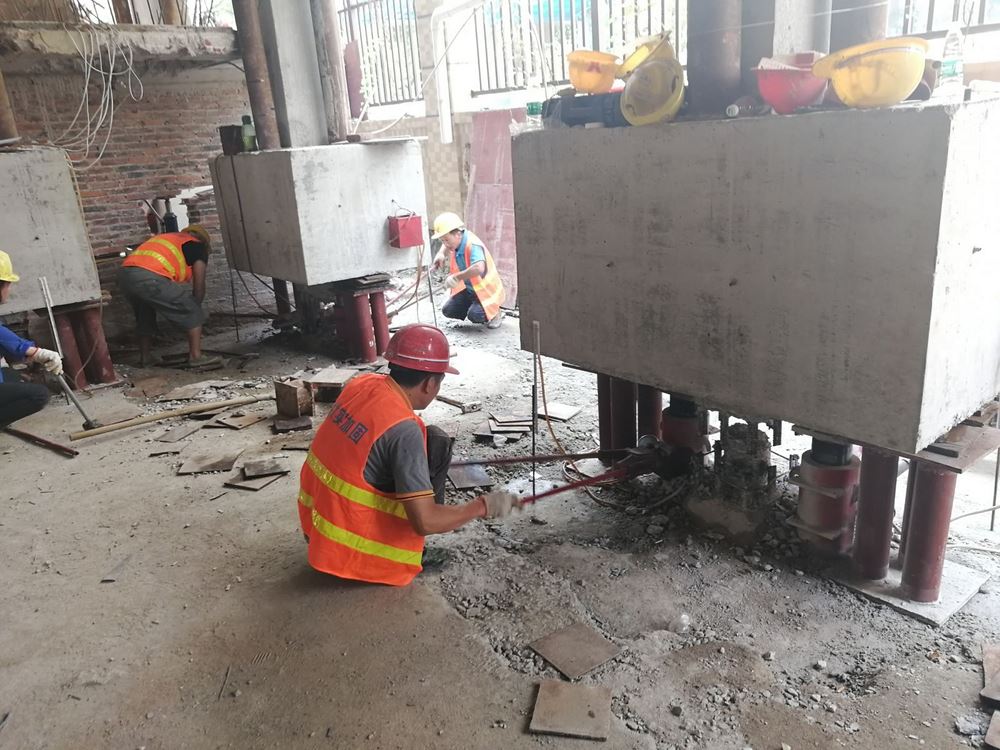 设置能支承整个建筑物的若干个支承点,通过这些支承点的顶升设备的启动,使建筑物沿某一直线(点)作平面转动,即可使倾斜建筑物得到纠正。若大幅度调整各支承点的顶高量,即可提高建筑物的标高。